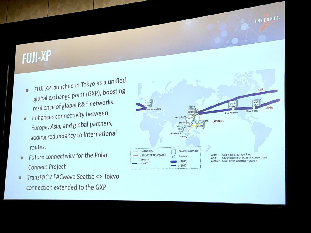 Meade outlined a broad range of ongoing and planned upgrades across international backbone and exchange infrastructures. This included new 400 Gbps transoceanic links—critical for data-intensive research and collaboration across continents. She also highlighted activity and continued evolution across multiple Global Exchange Points (GXPs), including FUJI-XP, SOE, GOREX, MANLAN, MOXY, NetherLight, and Pacific Wave. Together, these hubs form an important foundation for high-performance global connectivity between R&E networks.